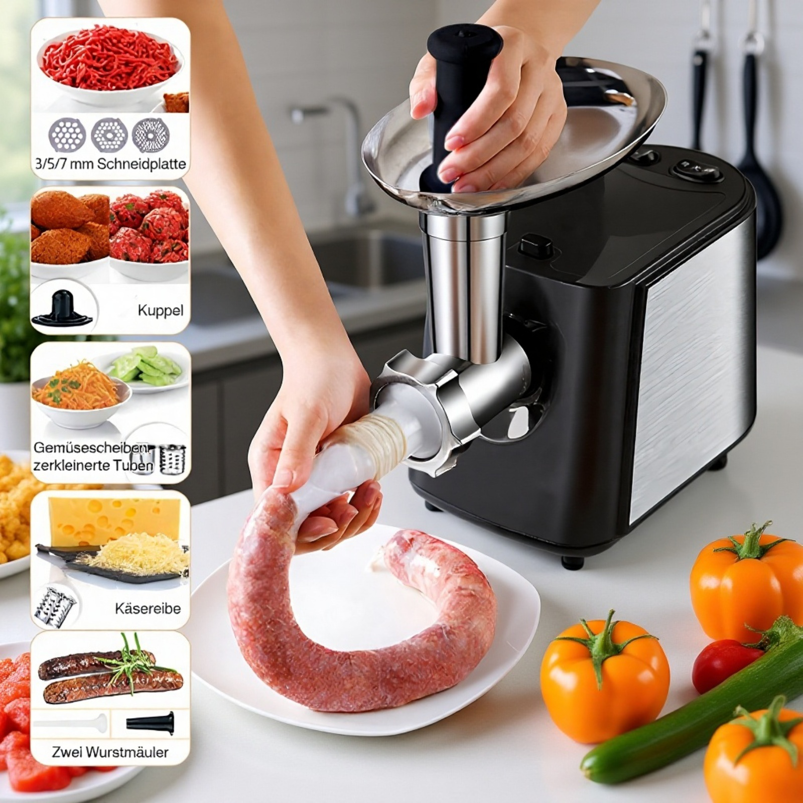 ● Vollautomatischer Fleischwolf aus hochwertigem Edelstahl sorgt für langlebige Nutzung und einfache Reinigung – ideal für jede moderne Küche. ● Leistungsstarker Elektromotor garantiert schnelles und müheloses Zerkleinern von Fleisch, Gemüse und weiteren Zutaten. ● Mit praktischem Wurstfüller-Aufsatz, perfekt für die einfache Zubereitung hausgemachter Würste und Spezialitäten nach eigenem Geschmack. ● Vielseitige Einsatzmöglichkeiten durch verschiedene Lochscheiben und Zubehör – für Hackfleisch, Pasteten, Kebbe und vieles mehr. ● Sicheres und komfortables Arbeiten dank rutschfestem Standfuß sowie Überhitzungsschutz für maximale Sicherheit im Alltag.